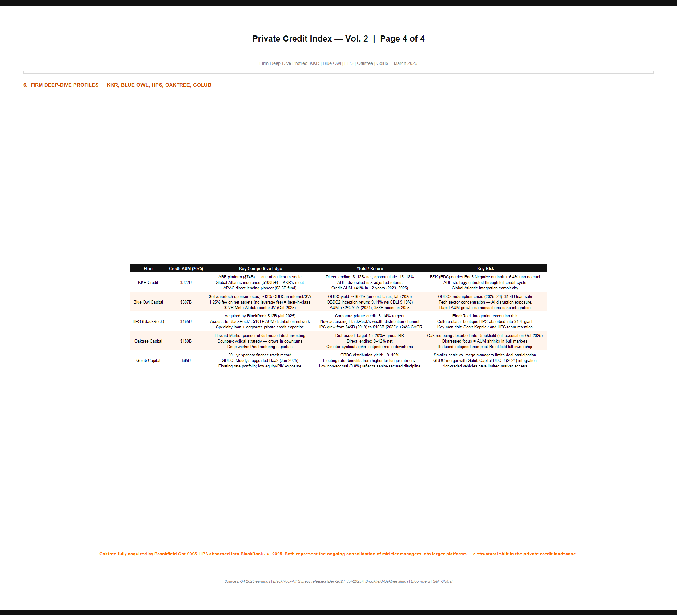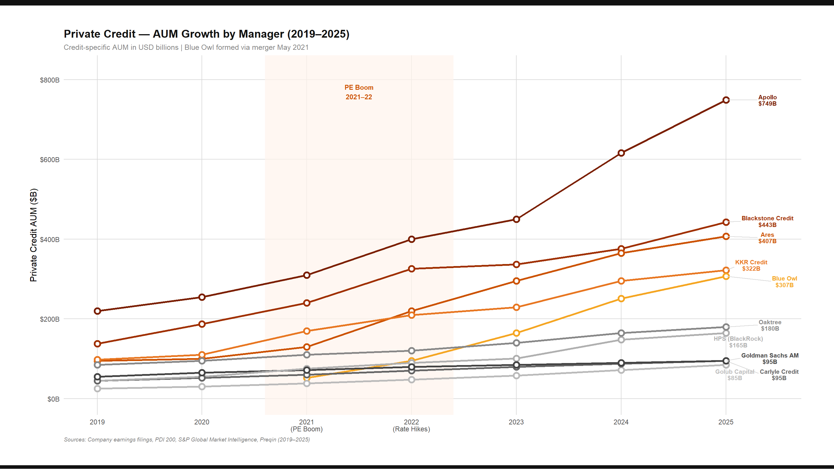 Apollo, Blackstone, Ares, KKR, Blue Owl, HPS, Oaktree, Golub, Owl Rock, and Sixth Street. Combined private credit AUM exceeds $2T. Analysis covers 2019–2025 growth, fund count, flagship vehicles, key personnel, and landmark transactions.