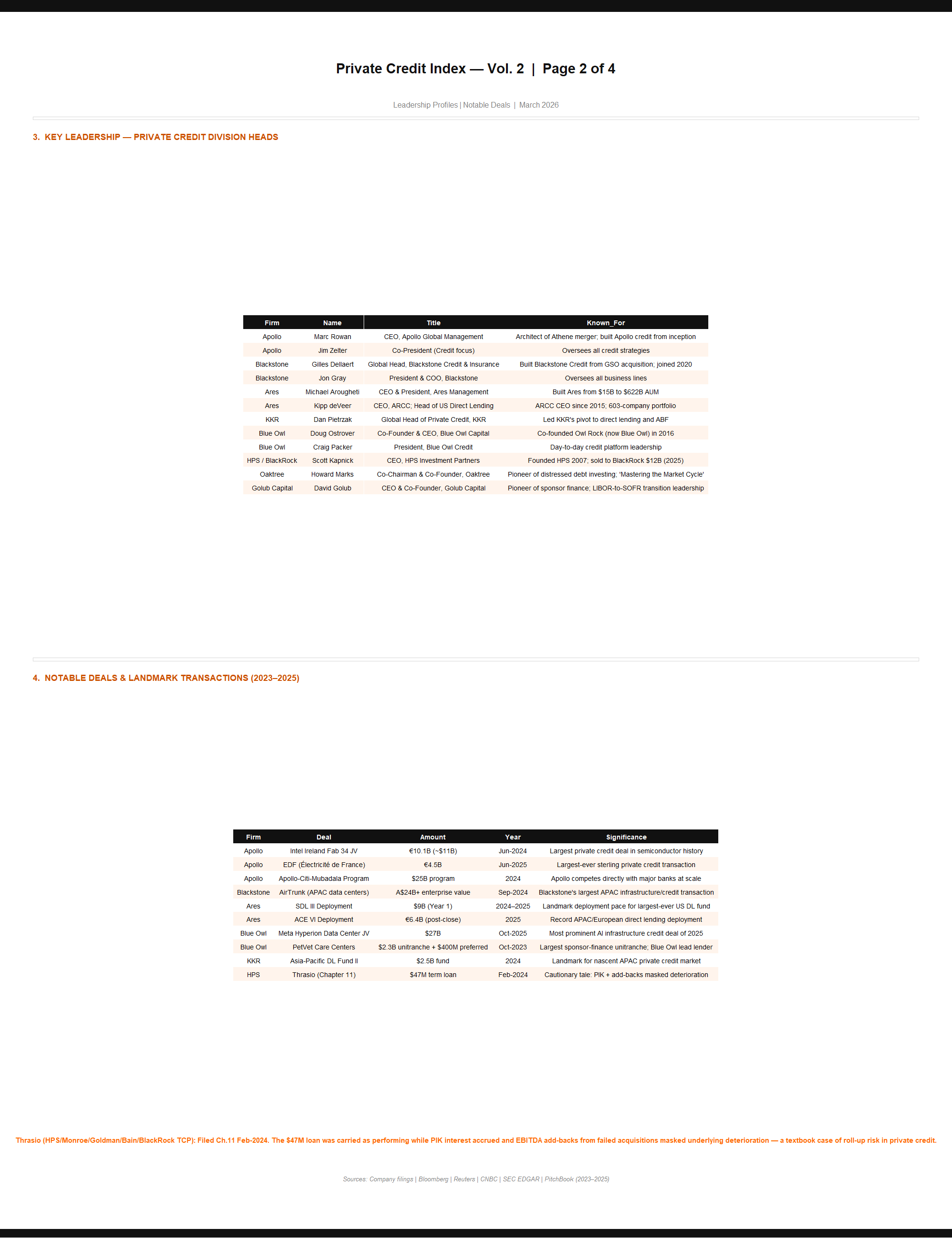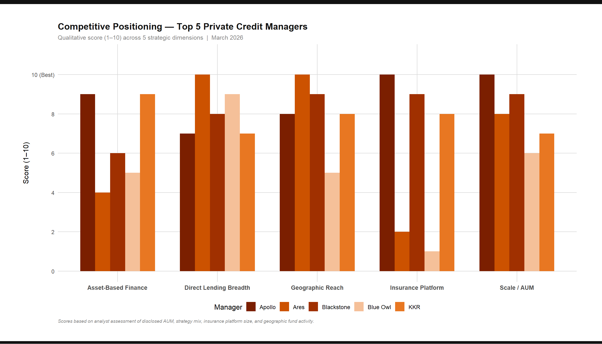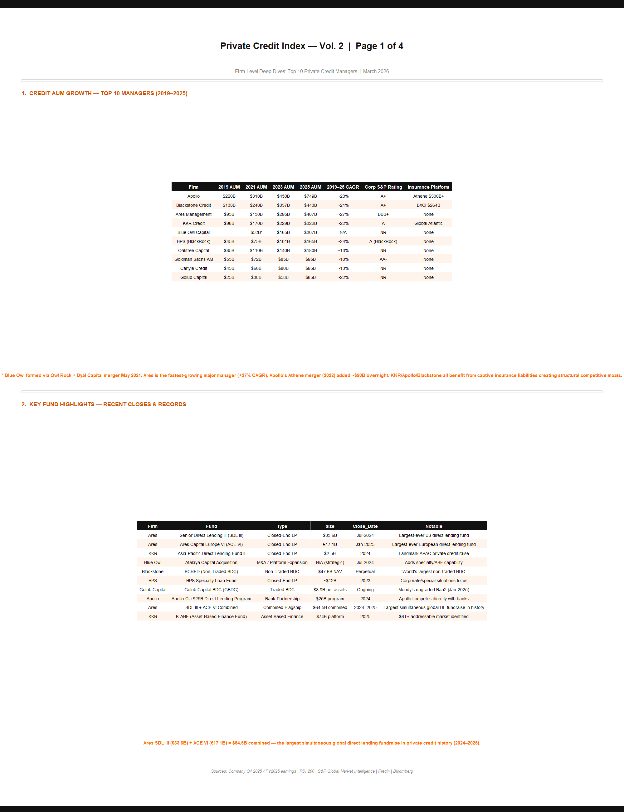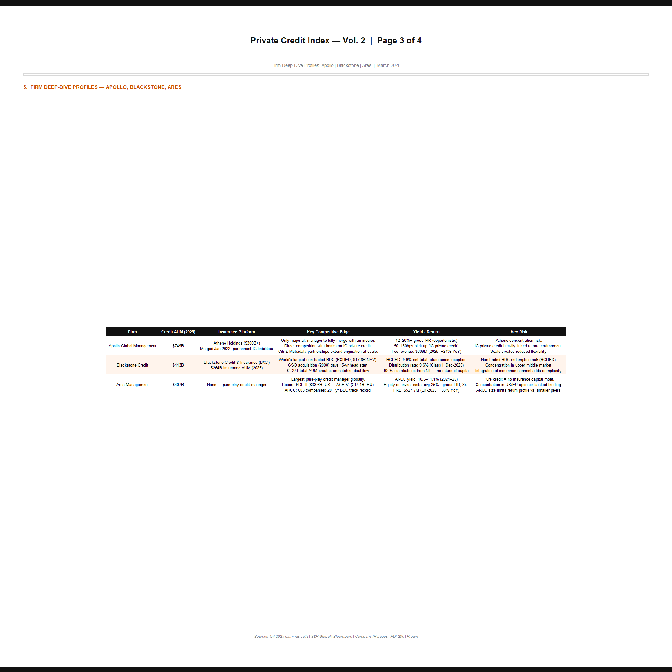 Detailed profiles of the top 10 private credit managers. Covers AUM growth trajectories, flagship fund structures, leadership, landmark deals, fee structures, yield/risk positioning, and competitive landscape. Sources: company filings, Bloomberg, Preqin.