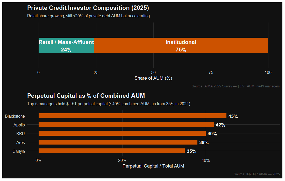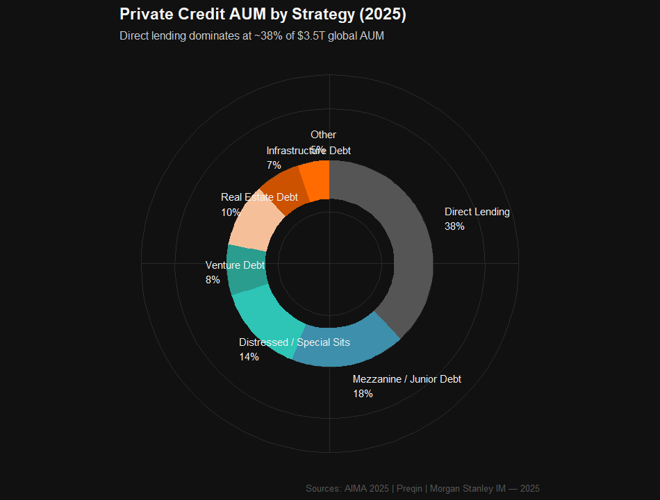 A structural analysis of the $3.5T private credit market: default rate methodology divergence (0.75% to 9.2%), spread compression (-160 bps since 2023), PIK shadow defaults doubling since 2021, credit secondaries surging to $20B, CLO formation at record $203B, and the growing role of insurance capital and retail allocation in reshaping the investor base.