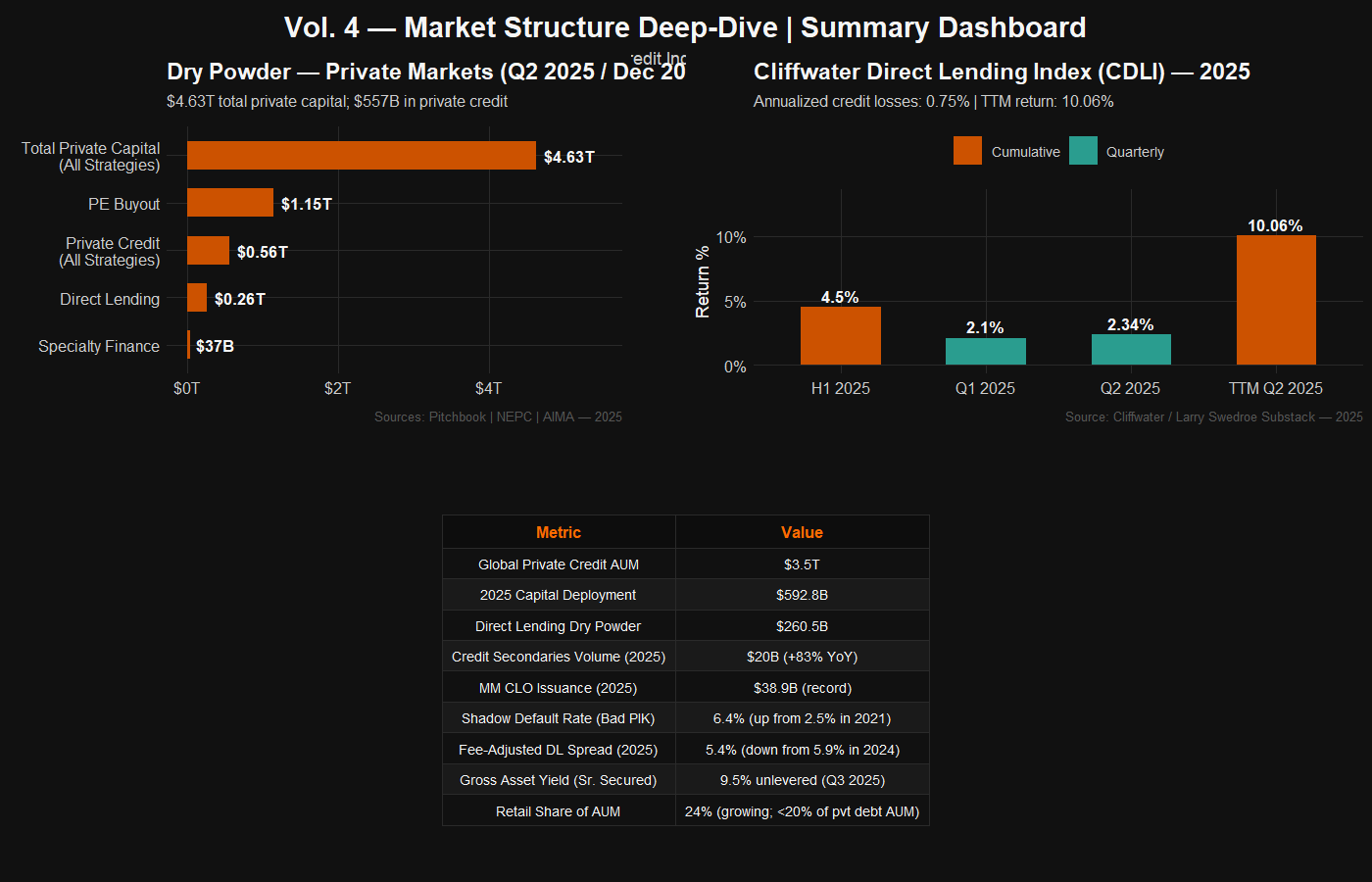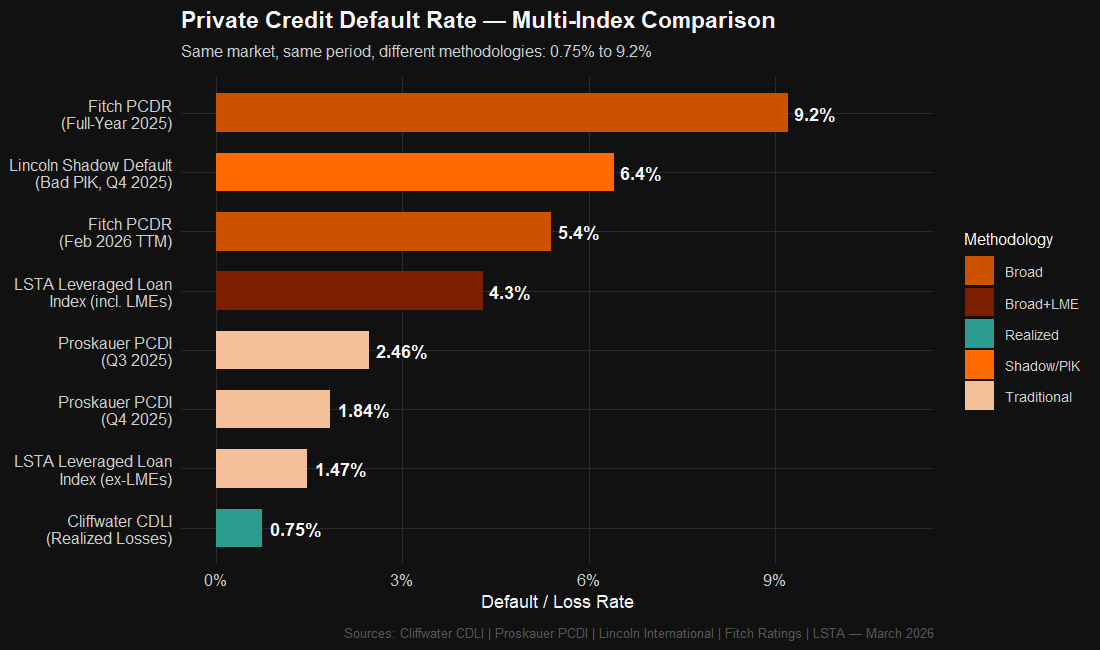 The same private credit market produces default rate readings of 0.75% (realized losses, CDLI) to 9.2% (Fitch full-year 2025) depending on methodology — a 12x range that reflects deep definitional opacity. Lincoln's shadow default rate (bad PIK) has more than doubled from 2.5% (Q4 2021) to 6.4% (Q4 2025), while direct lending spreads compressed over 160 bps since 2023. Global AUM reached $3.5T in 2025 — double the commonly cited $1.7T figure — with $592.8B deployed in 2024 alone. Credit secondaries nearly doubled to $20B, and MM CLO issuance hit a record $38.9B.