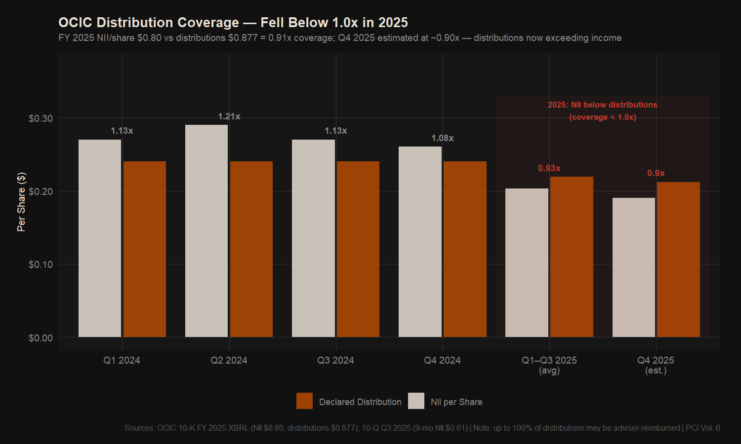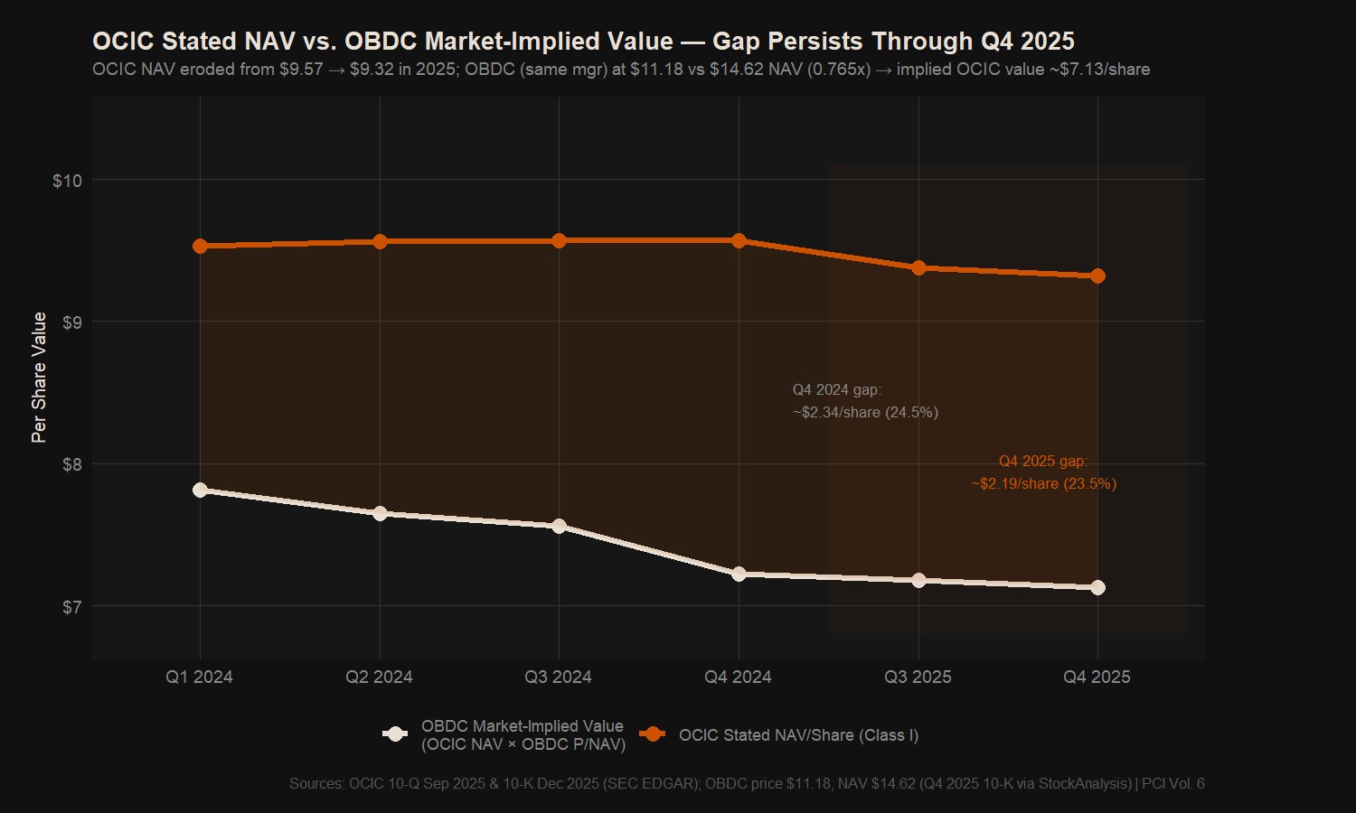 | OCIC Stated NAV/Share (Class I) | $9.57 | $9.32 (−$0.25 in 2025) |