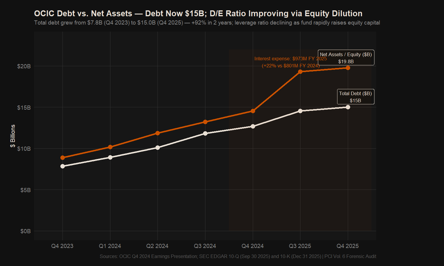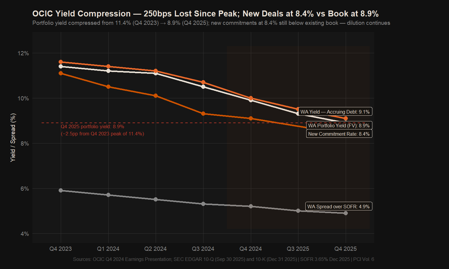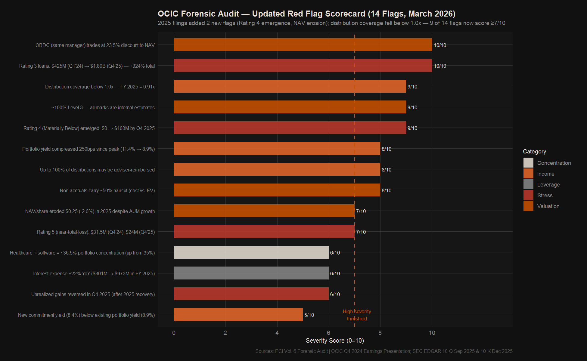 Sources: OCIC Q4 2024 Earnings Presentation · SEC EDGAR 10-Q (Sep 30, 2025) & 10-K (Dec 31, 2025) · CIK 0001812554 · OBDC NYSE pricing (March 24, 2026) · PCI independent analysis
