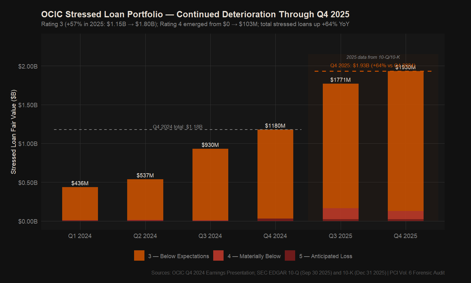 OCIC's headline NAV has been managed to near-flatness — $9.53 to $9.57 across all of 2024, then $9.32 by Q4 2025. But the internal portfolio rating data tells a different story. Rating 3 (Below Expectations) loans have grown +324% from Q1 2024 to Q4 2025 ($425M → $1.80B). Rating 4 (Materially Below) — a category that did not exist in Q4 2024 — emerged at $103M by year-end 2025. FY 2025 NII per share fell to $0.80 versus distributions of $0.877 — distribution coverage fell below 1.0× for the first time. And the publicly traded vehicle run by the same manager — OBDC — continues to trade at a ~23.5% discount to its own stated NAV. Applied to OCIC, that implies a market-clearing value of approximately $7.13 per share against the stated $9.32.