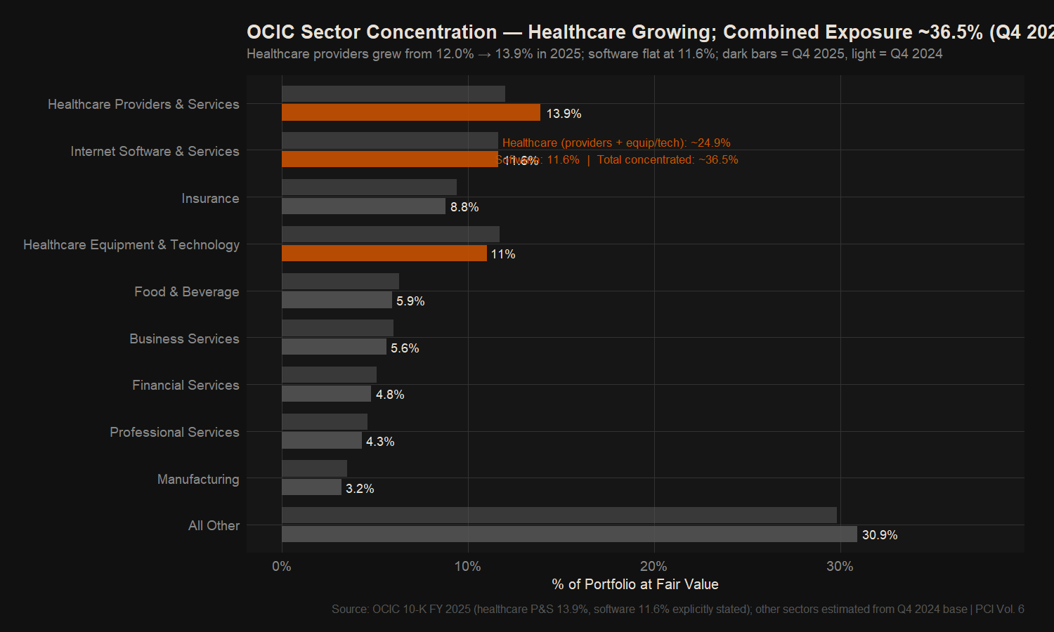 | Healthcare + Software Concentration | 35.3% | ~36.5% (healthcare providers grew to 13.9%) |