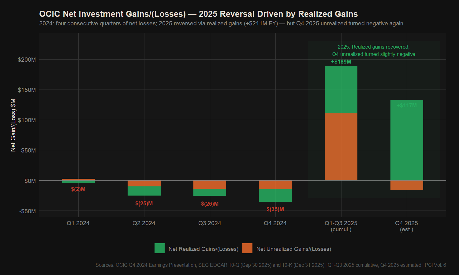 Investment Gains/(Losses) — 2025 Reversal via Realized Gains; Q4 Unrealized Negative Again